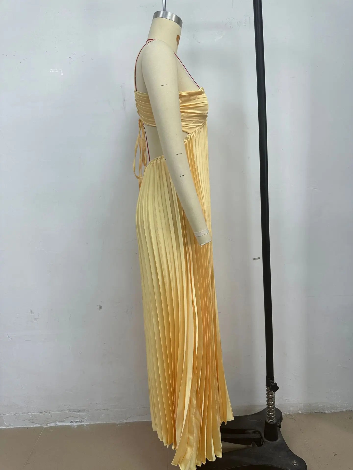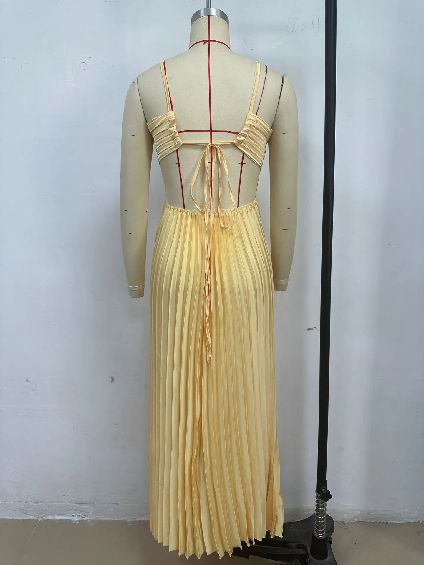 Ta długa sukienka maxi na cienkich ramiączkach to połączenie prostoty i klasy. Plisowany materiał nadaje całości lekkości, a wysoka talia podkreśla sylwetkę, tworząc kobiecy i elegancki efekt.